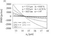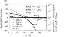 図7のグラフより、第2高次モードと第3高次モードのDMDおよび第4高次モードと第5高次モードがほぼ等しくなっており、群化されており、コア部の指数定数α=1.97を境にDMDが負から正になっている様子が分かる。さらに、コア部の指数定数αに対し各高次モードのDMDは比例の関係である。このことより、作製誤差により1本の光ファイバによる低DMD化が困難な場合においても、DMDが正と負の光ファイバをつなげ、ファイバ長を調整することによりさらなるDMDの低減化が可能である。 From the graph of FIG. 7, the DMD of the second higher order mode and the third higher order mode and the fourth higher order mode and the fifth higher order mode are substantially equal, grouped, and the core constant exponent α It can be seen that DMD changes from negative to positive at = 1.97. Furthermore, the DMD of each higher order mode is proportional to the exponent constant α of the core. As a result, even when it is difficult to reduce the DMD using a single optical fiber due to manufacturing errors, it is possible to further reduce the DMD by connecting the positive and negative optical fibers and adjusting the fiber length. .