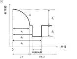 FIG. 1 is a diagram showing a refractive index distribution in the radial direction in the multimode optical fiber of the present embodiment. This multimode optical fiber, chromatic and core to a radius a1 from the center, and a cladding outside said core, and a low refractive index layer formed in the cladding from radius a2 to a radius a3, a The core is a graded type having an index constant α in which a refractive index profile in the radial direction from the center has a refractive index at the center as a relative refractive index Δ1 with respect to the cladding layer, and the low refractive index layer is The refractive index is a relative refractive index Δ2 with respect to the cladding layer.