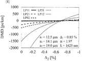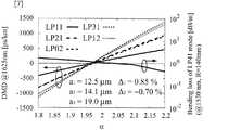 コア部の指数定数αを変えた場合、有限要素法に基づいて計算した高次モード(LP11、LP21、LP02、LP31、LP12モード)と基本モード(LP01モード)のDMDの変化を図7に示す。図7に示すように、コア部の指数定数αが1.94〜2.00の時に6つのモードにおいてDMDの絶対値が200ps/km以下となる。 FIG. 7 shows changes in DMD between the higher-order mode (LP11, LP21, LP02, LP31, LP12 mode) calculated based on the finite element method and the basic mode (LP01 mode) when the exponent constant α of the core is changed. . As shown in FIG. 7, when the exponent constant α of the core portion is 1.94 to 2.00, the absolute value of DMD is 200 ps / km or less in the six modes.