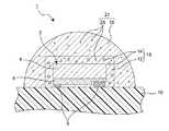 散乱層21は、透光性媒質18に粒子20を分散して構成されている。本実施の形態のように発光装置の出射角が大きい場合、半導体発光素子2と蛍光体層16の周囲を広い角度範囲に渡って散乱層21で覆うことが好ましい。散乱層21は、半導体発光素子2から出射した1次光が散乱を受けない場合の光線軌跡を考えて、発光装置1の出射角の範囲内にある光線が通過する領域に配置される。好ましくは、このような領域は全て散乱層21で覆う。本実施の形態では、散乱層21は、半導体発光素子2と蛍光体層16の全体を覆うように半球状に形成されている。散乱層21が半球状であれば、散乱層21と外部(空気)との界面における反射ロスが減るため好ましい。散乱層21は、半導体発光素子2の1次光を散乱させることができれば、どこに配置されていても良い。但し、半導体発光素子2の発光強度分布を改善するため、平面視において、矩形の半導体発光素子2が散乱層21の中心に位置することが好ましい。また、断面視において、散乱層21が半導体発光素子2の上面と側面を覆うようにすることが好ましい。散乱層21は、蛍光体層16の光出射側に配置する。尚、蛍光体層16の光出射側とは、蛍光体層16の2つの主面のうち半導体発光素子の1次光を受ける面とは逆の主面がある側を指す。蛍光体層16の光出射側に散乱層21を配置することにより、蛍光体層16を通過後の1次光の発光強度分布を改善できるため、最終的に色ムラを抑制し易い。一方で、散乱層21は蛍光体層16の2次光を強く散乱することはないので、2次光の余計な散乱による戻り光の増加も抑制できる。蛍光体層16の光出射側にある主面の全面を散乱層21で覆うことが好ましい。(Scattering layer 21)
