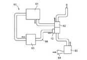 本発明実施例の消音器10は、過給器付きエンジン60に設けられる。過給器付きエンジン60は、図3に示すように、エンジン本体61と、過給器62と、インタークーラー63と、を備える。インレット64から吸気系に取り入れられた空気は、図3の矢印にて示されるように、エアクリーナ65にて不純物除去等が行なわれた後、過給器62を通って昇圧・昇温され、インタークーラー63にて温度が低下されてエンジン本体61に導入される。また、エンジン本体61からの排気は、過給器62を通りエネルギーの一部が吸気系空気の昇圧に利用されて車外に排出される。Hereinafter, an engine silencer with a supercharger according to an embodiment of the present invention will be described with reference to the drawings.