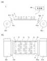 れており、各変位素子50が加圧室10上に位置するように配置されている。圧電アクチュエータ基板40は、加圧室10によって形成された加圧室群はとほぼ同一の形状の領域を占有している。また、各加圧室10の開口は、流路部材4の加圧室面4−1に圧電アクチュエータ基板40が接合されることで閉塞される。圧電アクチュエータ基板40は、ヘッド本体2aと同じ方向に長い長方形状である。また、圧電アクチュエータ基板40には、各変位素子50に信号を供給するためのFPCなどの信号伝達部が接続されている。第2流路部材には、中央で、上下に貫通している貫通孔6cがあり、信号伝達部は貫通孔6cを通して制御部88と電気的に繋がれる。信号伝達部は、圧電アクチュエータ基板の一方の長辺の端から他方の長辺の端に向かうように短手方向に伸びる形状にし、信号伝達部に配置される配線が短手方向に沿って伸び、長手方向に並ぶようにすれば、配線間の距離をとりやすくなり好ましい。Apiezoelectric actuator substrate 40 including adisplacement element 50 is bonded to the upper surface of the firstflow path member 4, and eachdisplacement element 50 is disposed so as to be positioned on the pressurizingchamber 10. Thepiezoelectric actuator substrate 40 occupies a region having substantially the same shape as the pressurizing chamber group formed by the pressurizingchamber 10. Further, the opening of each pressurizingchamber 10 is closed by joining thepiezoelectric actuator substrate 40 to the pressurizing chamber surface 4-1 of theflow path member 4. Thepiezoelectric actuator substrate 40 has a rectangular shape that is long in the same direction as the head body 2a. Thepiezoelectric actuator substrate 40 is connected to a signal transmission unit such as an FPC for supplying a signal to eachdisplacement element 50. The second flow path member has a throughhole 6c penetrating vertically at the center, and the signal transmission unit is electrically connected to thecontrol unit 88 through the throughhole 6c. The signal transmission unit has a shape extending in the short direction so as to extend from one long side end of the piezoelectric actuator substrate to the other long side end, and the wiring disposed in the signal transmission unit extends along the short direction. If it is arranged in the longitudinal direction, the distance between the wirings can be easily increased.