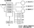 上記の実施の形態に係る集砂・除砂装置に備えられる制御装置100には、図10に例示するように、除砂始動ボタン(図示せず)を有する操作盤101が付加され、排水ポンプ制御手段PCON1、給水ポンプ制御手段PCON2及び揚砂ポンプ制御手段PCON3が内蔵され、さらに、切換弁制御手段VCONが内蔵されている。切換弁制御手段VCONは、後述されるように、前記一群の切換弁Va,Vb,Vc,Vdに所定の順序で開動作又は閉動作を駆動させるための制御信号を与えるものである。 As shown in FIG. 10, an operation panel 101 having a sand removal start button (not shown) is added to the control device 100 provided in the sand collecting / sand removing device according to the above embodiment, and a drain pump The control means PCON1, the feed water pump control means PCON2, and the sand pump control means PCON3 are incorporated, and the switching valve control means VCON is incorporated. As will be described later, the switching valve control means VCON gives a control signal for driving the group of switching valves Va, Vb, Vc, Vd to open or close in a predetermined order.