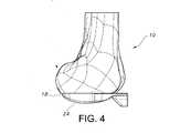 図4〜8は、遠位大腿骨トライアル18、および遠位大腿骨10上の切除表面14と近位脛骨12上の切除されていない表面(図2に示す近位脛骨12上の切除されていない表面20など)の間の遠位大腿骨トライアル18の挿入を示す。図4〜8に示すように、遠位大腿骨トライアル18は、平面の上部表面22および湾曲した下部表面24を含む。平面の上部表面22は、遠位大腿骨10上の切除表面14と接触するように構成される。内側顆表面26および外側顆表面28を含む湾曲した下部表面24は、近位脛骨12上の切除されていない表面20と接触し、少なくともある程度連結するためのものである。平面の上部表面22は、遠位大腿骨10上の切除表面14を形成して取り囲む骨との摩擦を改善するために、平坦、平滑、またはテキスチャ付きとすることができる。図7a〜7fに示すように、図4〜8の遠位大腿骨トライアル18は、大腿骨インプラント16、特に大腿骨インプラント16の下部部分30(図7cおよび7eに示す)の少なくとも一部によって画定された形状および厚さの少なくとも一部を実質上再現する。 4-8 show the