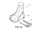 図23〜25に示す実施形態では、大腿骨トライアル80および構成要素82は、ACLおよびPCLに隣接する遠位大腿骨10の遠位溝部分を除去するために、ノッチカッタ84と組み合わせて使用される。図26〜28は、大腿骨トライアル80を、ノッチカッタ84とともに使用される一体化された大腿骨切断ガイドとともに示す。これらの図に示すノッチカッタ84は、長手方向軸86(たとえば、図24参照)に沿って延びる細長いチゼルであり、切断前縁部88を含む。切断前縁部88は、内側部分90、外側部分92、および内側部分と外側部分の間の中心部分94を有する。中心部分94は、ノッチカッタ内へ実質上窪んでおり、いくつかの実施形態では、遠位溝部分を切断するのに必要な力を低下させながら、切除(たとえば、図28参照)中に前靱帯または後靱帯が損傷する可能性を低下させることもできる。これらの図に示すノッチカッタ84は、U字状またはV字状の切断前縁部を形成するが、他の形状も可能である。 In the embodiment shown in FIGS. 23-25,