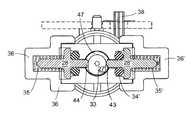 図の実施形態では、ポンプハウジング29は静止しており、ピストン27は、ポンプハウジング29内で平行移動される。この目的のために、ピストン27は、溝32の形態にある軸方向の位置のカム表面を備える。図4Aでわかるように、溝32は、モータ24に向かって位置する近位の押縁32bと、モータ24からピストン27の対向する端部で偏心カム表面33に向かって位置する遠位の押縁32aとを含む。ピン31など静止部材が、ポンプハウジング内の開口を通って収容され、モータシャフト22が回転するとき溝32の軸方向の平行移動部分に沿って案内されてピストンが近位の押縁32bの位置と遠位の押縁32aとの間で軸方向に前後に移動するのを抑える。当業者なら、ポンプハウジング29と係合するピストン27上の軸方向のカム表面は、ピストン27の軸方向の移動を提供するために様々な方法で具体化され得ることを理解するであろう。たとえば、溝は、ピストンの代わりにポンプハウジング上に位置してもよい。 In the illustrated embodiment, the