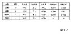 FIG. 17 is a table showing an example of biometric information to which a rank is added. In the table shown in FIG. 17, the order of the number of steps shown in FIG. 11 is added for each person. For example, in the second column of FIG. 17, “Father” and rank “3”, “Mother” and rank “2”, and “Child A” and rank “3” are associated with each other. In the ranks “3”, “2”, and “1”, “Father” has “4000” as the third most frequent step, “Mother” has “5000” as the second most common step, and “Child A” has the most. “8000” is the most common. The reason that the rank for “Child B” is blank is that the rank was not determined because the number of steps was not obtained for “Child B”.