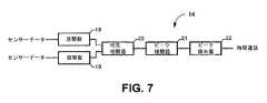制御装置7内の信号経路の主な構成要素のブロック図が図4に示されている。感知デバイス6は、マスタークロック8で同期してサンプリングを行う。マルチチャネル感知デバイスに対するチャネル間の同期誤差は低くなければならず、異なるサンプリングデバイスのチャネル間の同期誤差は同等でなければならない。好ましい実施形態では、チャネル間タイミング誤差は10ns以下に十分保たれる。感知デバイス間のタイミング誤差は1μs以下に保たれる。一実施形態では、センサー間で同期させた複数のクロックを用いて、センサーがセンサー出力をデジタルでサンプリングする。センサーは、物理的に離隔されていて(最大100m)、クロックが、処理ユニットからそれらに分配される。これらのクロックは、センサー間のサンプル時間誤差が1μs以下になることを保証する。 A block diagram of the main components of the signal path in the