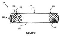 支持構造体は少なくとも1つのメッシュを含むことができる。例えば、単一のメッシュが装置の全長に沿って延びることができる。別の例において、装置の各端がメッシュを有し、その場合、メッシュは中間部分に達していなくても中間部分内に延びていてもよい。メッシュは、中間部分内にある場合、中間部分におけるよりも端部分において密度が高いか又は窓サイズが小さいものすることができ(例えば、メッシュのフィラメント間及び/又はストラット間の間隔がより小さい)、そのため、装置は端部分におけるよりも中間部分において可撓性が比較的高い。装置は、メッシュがないことによって、又は、実質的に均一な密度若しくは均一な密度又は実質的に均一な窓サイズ若しくは均一な窓サイズを有するメッシュを含む場合であっても(例えば、メッシュ密度若しくは窓サイズ以外の因子に起因して)、又は、不均一な密度を有するメッシュを含むことによって、端部分におけるよりも中間部分において可撓性が比較的高いものとすることができる。 The support structure can include at least one mesh. For example, a single mesh can extend along the entire length of the device. In another example, each end of the device has a mesh, in which case the mesh may extend into the intermediate portion without reaching the intermediate portion. If the mesh is in the middle portion, it can be denser or have a smaller window size at the end portion than in the middle portion (eg, smaller spacing between the filaments and / or struts of the mesh). Therefore, the device is relatively more flexible at the middle part than at the end part. The device may be due to the absence of a mesh or even if it includes a mesh having a substantially uniform density or uniform density or a substantially uniform window size or uniform window size (e.g., mesh density or By including a mesh with a non-uniform density (due to factors other than the window size) or at a non-uniform density, it may be relatively more flexible at the middle portion than at the end portion.