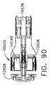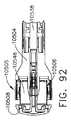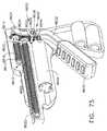 図2〜5を参照すると、一形態において、モータ80はモータ出力シャフト81を含み、モータ出力シャフト81は、モータ出力シャフト81に回転不能に取り付けられたモータ駆動ギヤ82を有している。モータ駆動ギヤ82は、以下で更に詳細に議論するように、噛み合う「動作可能な」係合を伝達組立体60となすように構成されている。少なくとも1つの形態において、伝達組立体60は伝達キャリッジ62を含み、伝達キャリッジ62は、駆動ギヤ82と第2の回転駆動シャフト42上のギヤ44及び46との間を軸方向に移動するように支持されている。例えば、伝達キャリッジ62は、支持シャフト63上にスライド可能に支承されてもよく、支持シャフト63は、伝達キャリッジの作用線が回転駆動システムのギヤトレーンに対して垂直となるように、ハウジング12内でシャフトマウント61上に装着される。シャフトマウント61は、ハウジング10内のスロット又は他の機構内に強固に支持されるように構成されている。伝達キャリッジ62は、支持シャフト63上に回転可能に支持されるキャリッジギヤ64を含み、駆動ギヤ82とは駆動係合をなす一方で、ギヤ44及び46とは選択的に噛み合い係合をなすように構成されている。図2〜5に示す装置構成において、伝達キャリッジ62は、シフタ、つまり「シフトさせるための手段」70に動作可能に取り付けられており、このシフトさせるための手段70は、「第1の駆動位置」と「第2の駆動位置」との間で伝達キャリッジ62を軸方向にシフトさせるように構成されている。一形態において、例えば、シフトさせるための手段70は、ハンドル14のハウジング12内に支持されるシフタソレノイド71を含んでいる。シフタソレノイド71は、双安定ソレノイドを含んでもよく、又は例えば、「二段配置ばね荷重式」ソレノイドを含んでもよい。図示の装置構成は、例えば、伝達キャリッジ62を第1の駆動位置へと遠位方向「DD」に付勢するばね72を含んでおり、キャリッジギヤ64は、中間駆動ギヤ46と噛み合い係合をなす一方で、駆動ギヤ82とも噛み合い係合をなす。第1の駆動位置にあるとき、モータ80が作動することにより、結果として、ギヤ82、46及び24が回転することになり、これによって最終的に、第1の駆動シャフト22が回転することになる。本明細書で更に議論するように、シフタソレノイド71は発射トリガ90によって作動されてもよく、発射トリガ90は、図2及び5に示すように、ハンドル14のハウジング12上に旋回式で支持されている。図示の実施形態において、発射トリガ90は、ハンドル14内に装着された発射トリガシャフト92上に旋回式で支持されている。発射トリガ90は通常、非作動位置において発射トリガばね94によって付勢されている。図3を参照されたい。発射トリガ90は、発射スイッチ96を動作可能に作動させるように装着されており、発射スイッチ96は、制御回路基板組立体100上に動作可能に支持されている。図示の装置構成において、発射トリガ90が作動することにより、結果としてシフタソレノイド71が作動する。図61、63、64に関連して本明細書で以下に更に詳細に記述するように、ハンドル用プロセッサ7024は、駆動信号をシフタソレノイド7032(71)に与える。ここで再び図2〜5を参照するが、このように、発射トリガ90が作動する結果として、シフタソレノイド71が伝達キャリッジ62を近位方向「PD」に引っ張り、それによって、キャリッジギヤ64を移動させて第2の駆動ギヤ44と噛み合い係合させることになる。図7を参照されたい。キャリッジギヤ64が駆動ギヤ82及び第2の駆動ギヤ44と噛み合い係合をなしているときにモータ80が作動することにより、結果として、第2の駆動シャフト42が第2の駆動シャフト軸「SDA」を中心として回転することになる。また図2〜5で分かるように、シフト式伝達組立体60はまた表示システム74を含んでもよく、表示システム74は、制御基板100並びに伝達表示灯77に動作可能に結合された一対のスイッチ75及び76を含んでいる。スイッチ75、76は伝達キャリッジ62の位置を検出するように働き、その結果、制御システムは、伝達キャリッジ62の位置に応じて表示灯77を作動させることになる。例えば、表示灯77は、伝達キャリッジ62が第1の駆動位置にあるときに付勢されてもよい。これにより、モータ80が作動する結果として第1の駆動システム20が作動する指示が、臨床医に示唆される。 2 to 5, in one form, the