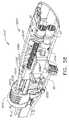 第1及び第2の回転駆動システム20、40は、2つのパワートレーンの間で動力/運動を事実上シフトさせる、独特かつ新規な「シフト式」伝達組立体60を通じて、モータ80によって動力供給される。第1の回転駆動システム20は第1の回転駆動シャフト22を含み、第1の回転駆動シャフト22は、ハンドル14のハウジング12内で回転可能に支持され、第1の駆動シャフト軸「FDA−FDA」を規定する。第1の駆動ギヤ24は、第1の駆動シャフト軸FDA−FDAを中心として第1の回転駆動シャフト22と共に回転するように、第1の回転駆動シャフト22にキー結合されるか、あるいは別様に回転不能に固定される。同様に、第2の回転駆動システム40は第2の回転駆動シャフト42を含み、第2の回転駆動シャフト42は、ハンドル14のハウジング12内で回転可能に支持され、第2の駆動シャフト軸「SDA−SDA」を規定する。少なくとも1つの装置構成において、第2の駆動シャフト軸SDA−SDAは、第1の駆動シャフト軸FDA−FDAからずれており、かつ第1の駆動シャフト軸FDA−FDAに対して平行であるか、又は実質的に平行である。この状況で用いられるとき、「ずれる」という用語は、例えば第1の駆動シャフト軸と第2の駆動シャフト軸とが同軸でないことを意味する。第2の回転駆動シャフト42は第2の駆動ギヤ44を有し、第2の駆動ギヤ44は、第2の駆動シャフト軸SDA−SDAを中心として第2の回転駆動シャフト42と共に回転するように、第2の回転駆動シャフト42にキー結合されるか、あるいは別様に回転不能に固定される。それに加えて、第2の駆動シャフト42は中間駆動ギヤ46を有し、中間駆動ギヤ46は第2の回転駆動シャフト42上で回転可能に支承されており、そのため、中間駆動ギヤ46は、第2の駆動シャフト軸SDA−SDAを中心として第2の回転駆動シャフト42上で自在に回転可能となっている。 The first and second