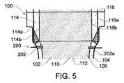 いくつかの実施形態においてパターニングユニット200は、図5に示されているように、連続リボン102の第1のエッジ領域114および第2のエッジ領域116に係合する。パターニングユニット200は、第1のエッジ領域114および/または第2のエッジ領域116において、コア層102の被覆されていない領域の実質的に全幅に係合する。例えばパターニングユニット200は、第1のエッジ領域の実質的に全幅に沿って第1のエッジ領域114に係合する。そのために、第1のパターニング部材202および第2のパターニング部材212の夫々の長さは、少なくとも第1のエッジ領域114の幅と同じ長さである。第1のエッジ領域114が2以上のビードを含むいくつかの実施形態では、連続リボン102が第1のパターニング部材202と第2のパターニング部材212との間を通過すると、第1のパターニング部材および第2のパターニング部材の夫々は、第1のエッジ領域114の第1のビード114aおよび第2のビード114bの両方に係合する。この形では、第1のビード114aおよび第2のビード114bの両方の厚さが(例えば、凹凸パターンを形成することによって)パターニングユニット200によって選択的に減少される。同様に、第2のエッジ領域116が2以上のビードを含むいくつかの実施形態では、パターニングユニット200は第2のエッジ領域の実質的に全幅に沿って第2のエッジ領域116に係合する。そのために、第3のパターニング部材202aおよび第4のパターニング部材212aの夫々の長さは、少なくとも第2のエッジ領域116の幅と同じ長さである。連続リボン102が第3のパターニング部材202aと第4のパターニング部材212aとの間を通過すると、第3のパターニング部材および第4のパターニング部材の夫々が第2のエッジ領域116の第1のビード116aおよび第2のビード116bの両方に係合して、第1のビードおよび第2のビードの両方の厚さを選択的に減少させる。 In some embodiments, the