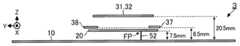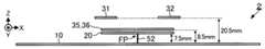 なお、無給電素子31,32は、アンテナ素子20とのZ方向の離間間隔が13mm(20.5mm−7.5mm)あるが、Z方向からアンテナ1を平面視した場合にアンテナ素子20と重なる部分を有する。一方、無給電素子33,34は、Z方向からアンテナ1を平面視した場合にアンテナ素子20と重なる部分はないが、アンテナ素子20とのY方向の離間間隔が1mmと小さい。このように4つの無給電素子31〜34は、いずれもアンテナ素子20と離間しているが、アンテナ素子20の近傍に配置されている。また、図2および図3に示すように、無給電素子31,32は、アンテナ素子20よりZ方向側(アンテナ素子20を挟んでグランド板10とは反対側)に配置されているのに対し、無給電素子33,34は、アンテナ素子20と同一平面上に配置されている。 The