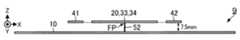 なお、給電点FPのオフセット方向が−X方向または+X方向であって、アンテナ素子20の中心Cと給電点FPとを結ぶ直線SLの延在する方向(第1方向)が±X方向になり、この第1方向と直交する方向が±Y方向になる場合は、アンテナ素子20に対して±X方向の両側に設けられた無給電素子31,32に対し、本実施形態で説明した無給電素子35,36と同様の構成を採用すればよい。 The offset direction of the feed point FP is the −X direction or the + X direction, and the direction (first direction) in which the straight line SL connecting the center C of the