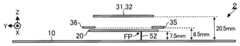 第1実施形態に係るアンテナ1では、アンテナ素子20に対して±Y方向の両側に設けられた無給電素子33,34の各々が、アンテナ素子20と同一平面上に配置され(図2,図3)、Z方向からアンテナ1を平面視した場合にアンテナ素子20と重なっていない(図1)。これに対し、第2実施形態に係るアンテナ2では、アンテナ素子20に対して±Y方向の両側に設けられた無給電素子35,36の各々が、アンテナ素子20よりZ方向側に配置され(図15,図16)、Z方向からアンテナ2を平面視した場合にアンテナ素子20と一部が重なっている(図14)。(1) Positions of