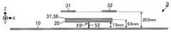 第2実施形態に係るアンテナ2では、Z方向からアンテナ2を平面視した場合に、無給電素子35,36とアンテナ素子20との重なる部分のY方向の幅がどちらも5mmである(図14)。これに対し、第3実施形態に係るアンテナ3では、Z方向からアンテナ3を平面視した場合に、無給電素子37,38とアンテナ素子20との重なる部分のY方向の幅が、無給電素子37の場合は7mmであり、無給電素子38の場合は8mmである(図19)。(2) Positions of the