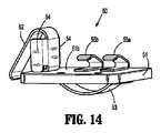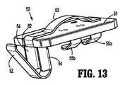 ここで図15−21を参照すると、アダプタ基板アセンブリ50と認証基板アセンブリ30との間の相互作用が、示されている。図15、16、および19で見られるように、アダプタ基板50は、ばねクリップ52によって装填ユニットアダプタ15内で保持される。ばね53は、接触部材55が孔61の中へ延びるように、外管57に力を加え、孔61に向かって内向きにアダプタ基板50を付勢する。アダプタ連結器27が装填ユニットアダプタ15の孔61に完全に挿入されると、アダプタ連結器27および装填ユニット連結器15の初期回転の向きは、認証基板30の接触部材40とアダプタ基板50の接触部材55とがほぼ45°離れているようなものである(図20)。装填ユニット16がアダプタアセンブリ14に対して回転させられると、認証基板30の接触部材40は、アダプタ基板50の接触部材55と係合させられる。有利なことには、装填ユニット16のアダプタ連結器27の接触支持体34は、アダプタ基板50の嵌合接触部材55に係合すると、半径方向支持を接触部材30に提供する。加えて、ばね53は、外管57に力を加え、これは、アダプタ基板50が認証基板30および装填ユニット連結器15に対して浮動することを可能にし、それによって、種々の構成要素の間の製造変動を補償し、認証基板30とアダプタ基板50との間に確実な接続を提供する。 Referring now to FIGS. 15-21, the interaction between the