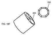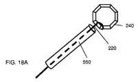 ガイド管550と、ガイド要素220と、デバイス240との間の相互作用が、図18A−18Fにより詳細に例証される。図18Aに示されるように、デバイス240は、ガイド管550の管腔を通して延設する、ガイド要素220に結合される。図18A−18Fのデバイス240は、8つの磁性セグメントを伴う自己集合吻合デバイスで達成されるであろうように、八角形として描写されるが、しかしながら、デバイス240は、任意のリングまたは多角形であり、自己集合するか、またはそうではない場合がある。図18Bに示されるように、ガイド管550は、内視鏡の作業チャネルであり得る、管腔200を介して送達される。ガイド管550はまた、トロカール、カテーテル、または細針吸引デバイスを介して送達されることもできる。  The interaction between