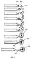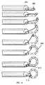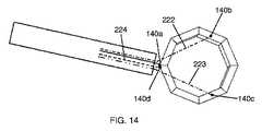図10−14は、テンショナおよび複数のガイド要素を用いた自己閉鎖磁気吻合デバイスの展開を描写する。デバイス240の送達および展開は、例えば、少なくともガイド要素221への張力を用いてプッシャを前進させることによって開始される。磁性セグメント140が管腔200から排出されるにつれて、ガイド要素221への張力は、最遠位端部セグメント140aを押勢し、デバイス240の集合を開始する。さらに、ガイド要素224への張力は、デバイス240が集合するように、最近位端部セグメント140dを押勢し、最遠位端部セグメント140aと接触させる。ユーザは、次いで、それぞれのガイド要素に張力を維持するように、テンショナ700上にそれぞれの制御部材702−708を係止してもよい。例えば、教示されるガイド要素221は、不注意な捕捉から組織襞を偏向させるだけではなく、従来はデバイス240の8つの誘引性留め継ぎによって確実にされていた腸管腔内に緊密な「旋回半径」を確実にする潜在性を有する。いったん最遠位および最近位端部セグメント140a、140dが、それらの捕捉距離内でガイド要素221、224によって引動されると、セグメント140aおよび140dの近接範囲誘引が、図14に示されるように、他方の反発力より優勢になり、リング間隙を閉鎖することができる。リングは、完全に長円形あってもよいが、閉鎖される。この時点で、他のガイド要素222および223は、多角形を引締し、任意の偏向または不整合を修正するために使用されてもよい。ガイド要素221−224を係止することによって、ガイド要素の暴露される長さの側方偏向が、適切な張力を印加することができる。いったん展開されると、張力下のガイドワイヤは、磁気セットを整合および噛合させるために使用されることができる。これは、蛍光透視法を使用して可視化されてもよい。  FIGS. 10-14 depict the deployment of a self-closing magnetic anastomosis device using a tensioner and a plurality of guide elements. Delivery and deployment of the