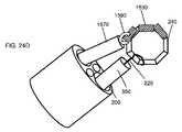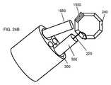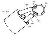 磁気吻合デバイスへの重量を変更する(質量を追加する)ための一方法が、図24A−24Dに描写される。図18A−18Fに示されるものに類似する構成を使用して、ガイド要素220に結合されるデバイス240が、管腔200(例えば、内視鏡の作業チャネル)を通して送達されるガイド管550を使用して組織に送達される。いったんデバイス240がおおよその位置に来ると、補助カテーテル1550が、デバイス240にもたらされ、取り外し可能な重り1530が本デバイスに取り付けられることを可能にする。いくつかの実施形態では、取り外し可能な重り1530は、強磁性であるため、それらは、本デバイスにおける磁性セグメント140に自然に誘引される。そのような取り外し可能な重り1530は、生体適合性を向上させるために、例えば、PTFE等のポリマーを用いて取り外し可能な重りをコーティングすることによって、コーティングされてもよい。代替実施形態では、取り外し可能な重り1530は、生体適合性接着剤またはゲルを用いてデバイス240に結合されてもよい。いったん取り外し可能な重り1530がデバイス240に送達されると、補助カテーテル1550は、図24Bに示されるように、本デバイスから後退される。取り外し可能な重り1530を伴う最終デバイス240が、図24Cに示されるように出現し得る。デバイス240に提供される付加的重量は、デバイス240を操作することをより容易にし、隣接する組織上に噛合デバイスが接触する際に本デバイスを補助するであろう。図24Cに示されるように、ガイド要素220および/またはガイド管550は、重り付きデバイス240を操作および留置するために使用されることができる。加えて、患者は、図23Aおよび23Bに関して上記に説明されるように、重り付きデバイス240が別のデバイスと噛合することに役立つように移動されてもよい。最後に、いったんデバイス240が適切な位置を達成すると、取り外し可能な重り1530は、補助マニピュレータ1570を用いてデバイス240から除去され、噛合したデバイスが過剰な重量に起因してその最終位置から移動しないことを確実にすることができる。  One method for changing the weight (adding mass) to the magnetic anastomosis device is depicted in FIGS. 24A-24D. Using a configuration similar to that shown in FIGS. 18A-18F, the