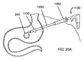 別の実施形態では、デバイス240は、腹腔鏡手技等において使用されるトロカール1050を通して留置される、送達カテーテル1030を含むシステムを用いて組織に送達されることができる。図19に示されるように、それに取り付けられるガイド要素220を伴う自己集合デバイス240は、ガイド要素220が延設され得る管腔を有する伸長マニピュレータ1070を用いて送達カテーテル1030を通して押動されることができる。上記の図2−5および9−15に類似して、ガイド要素220は、デバイス240との1つもしくは複数の接続点を有してもよいか、または本デバイスは、半径方向要素510(図19に図示せず)を含んでもよい。加えて、ガイド管550送達に関して上記に説明されるように、伸長マニピュレータ1070はまた、デバイス240がガイド要素220に結合されたまま、伸長マニピュレータ1070をデバイス240にもたらし、次いで、伸長マニピュレータ1070をデバイス240から後退させることによって、「緊密保持」および「弛緩保持」の両方の可撓性を提供する。  In another embodiment, the