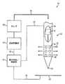 ポンプ116は、電力供給/制御部118により制御されてよい。電力供給/制御部118は、ポンプ116に電気制御信号を供給して、ポンプに、所望の流速の流体を生成させることができる。電力供給/制御部118は、電気接続120によってポンプ116に接続されてよい。電力供給/制御部118は、さらに、接続122によって長尺部102に、および、接続126によってコレクタ電極124に、電気的に接続されてもよい。加えて、電力供給/制御部118は、同様の電気接続によって加熱アセンブリ110に接続されてもよい。  The