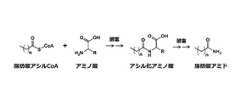 ヒトを含めた動物、植物、微生物の体内では、脂肪酸シンターゼによってアセチルCoA(コエンザイムA)とマロニルCoAから直鎖の飽和脂肪酸が作られている。この脂肪酸は小胞体等で炭素数を増やし、例えば脂肪酸合成が炭素数18(ステアリン酸)に達すると、ステアリン酸の中央(ω−9位)に二重結合が生成されて体内で一価不飽和脂肪酸であるオレイン酸が生成される。また、これらの脂肪酸はアシルCoA合成酵素(ACS)により触媒されて、図1に示すように、チオエステル結合を有する脂肪酸のアシル化物(例えば、脂肪酸アシルCoA)へと変換されて活性化される。この脂肪酸アシル化物が、体内のアミノ酸と酵素的に反応してアシル化アミノ酸となり、さらに酵素的な反応によりアミド型の脂肪酸アミドが形成されると考えられる。バイオマーカーとしての脂肪酸アミドは、かかる生体内脂質由来の脂肪酸アミドおよびその誘導体を広く対象とすることができる。[Fatty acid amide]