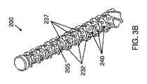 図3Aの実施形態では、複数の出口孔(図示せず)が、螺旋または渦巻溝付き領域236に沿って等、螺旋または渦巻線に沿って延在し得る。図3Bに示される実施形態では、複数の出口孔240は、溝付き領域237内に配置され得、したがって、孔は、伸長本体の円周の周囲で複数のリングを中心として延在する。  In the embodiment of FIG. 3A, a plurality of outlet holes (not shown) may extend along the spiral or spiral, such as along the spiral or spiral