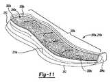 いくつかの構成では、小塊状ケーシング300aは粒子状物質350を収容し、アウトソール210aの内面214aのキャビティ240a内に存在し得る。図10は、長軸Lに沿って、第1の端部302aと第2の端部304aとの間に延びる長さを有する小塊状ケーシング300aを示す履物用品10aの分解図を示す。ケーシング300aは、ミッドソール220a及びアウトソール210aの輪郭に実質的に一致するサイズ及び形状を有することができる。ミッドソール220aは、図1〜図8のミッドソール220を形成する可撓性材料から形成されてもよく、ミッドソール220aに十分な可撓性を付与し、それによって、小塊状ケーシング300a内に配置され、キャビティ240a内に存在する粒子状物質350が、ソール構造200aの傾斜荷重負荷の間に足の底面の特性と相互作用することを可能にする。ケーシング300aは、粒子状物質350で満たされたときに、キャビティ240aを少なくとも部分的に充填する容積も含む。図11は、粒子状物質350を含み、キャビティ240a内に存在するケーシング300aを示すアウトソール210aの上部斜視図を示す。この例では、第1の端部302aは踵部16に近接して配置され、第2の端部304aは、ケーシング300aが内面214a上に横たわるとき前足部12に近接して配置される。 In some configurations, the