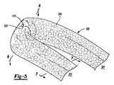 図5は図2〜図4のケーシング300の部分斜視図で、粒子状物質350を含み、その中間点に第1の折り目310を含むケーシングを示す。ケーシング300が折り畳まれてキャビティ240内に配置されると、ソール構造200による繰り返しの圧縮により、ケーシング300内の粒子状物質350の移動に応答して、第1の折り目310がゆるみ、解かれ、または部分的に広がり得る。このシナリオでは、粒子状物質350は、中間点310の一方の側から中間点310の他方の側に移動し、それによってケーシング300内に存在する粒子状物質350の不均一な分布をもたらし、クッション性をほとんど提供しない。いくつかの実施形態では、第1の折り目310が展開しないように、ケーシング300は、第1の折り目310に対応する所定の位置(例えば、中間点)を画定するためのステッチング(縫合部)526を含む。図6は図5の線6−6で切った断面図で、図6は、所定の位置(例えば、中間点)を画定し、第1の折り目310を維持するために、ステッチング526または他の固定技術によって共に固定されたケーシング300の外壁308及び/又は内壁306の1つ以上の部分を示す。中間点の第1の折り目310は、粒子状物質350がケーシング300全体にわたって自由に動くことを制限し、さらにケーシング300をキャビティ240に容易に組み付けることを可能にする屈曲点が設けられる。 FIG. 5 is a partial perspective view of the