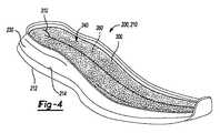 図4は、アウトソール210の上部斜視図で、粒子状物質350を含み、キャビティ240内に配置されている時、中間点に第1の折り目310を含むケーシング300を示す。ケーシング300は可撓性を有し、ケーシングが内面214の輪郭及びケーシング300を拘束する側壁230の輪郭に一致することを可能にする。ケーシング300は、部分的または全体的にキャビティ240を充填し得る。いくつかの例では、少なくともケーシング300の一部分が、キャビティ240の深さを超えて側壁230の上方に存在する。これらの例では、アウトソール210がミッドソール220またはアッパー100に取り付けられると、粒子状物質350を含むケーシング300は、アウトソール210の内面214とミッドソール220の底面222との間で圧縮する。 FIG. 4 is a top perspective view of the
