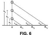 実効高(heff)の位相シフトΦを変更することなく帯電端子T1の物理的高さが低減される場合、結果として生じる電界は、誘導表面導波プローブ200から低減した距離においてブルースター角で損失性導電媒体203と交差する。図6は、電界がブルースター角で入射する距離についての帯電端子T1の物理的高さを低減する効果をグラフで示す。高さがh3からh2を経てh1まで低減されると、電界が損失性導電媒体(例えば、地球)とブルースター角で交差する点は、帯電端子位置に近づいて移動する。しかし、式(39)が示すように、帯電端子T1の高さH1(図3)は、ハンケル関数の遠方コンポーネントを励起するために、物理的高さ(hp)以上でなければならない。帯電端子T1を実効高(heff)以上に配置して、損失性導電媒体203を、図5Aに示すように、ハンケル交差距離(Rx)121以上でブルースター入射角(Ψi,B=(π/2)−θi,B)で照射することができる。帯電端子T1上の拘束電荷を低減又は最小化するために、上述したように、高さは、少なくとも帯電端子T1の球直径(又は等価な球体直径)の4倍でなければならない。If the physical height of the charging terminal T1 is reduced without changing the effective height (heff ) phase shift Φ, the resulting electric field is Brewster's angle at a reduced distance from the inductive