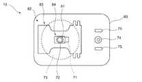 ハウジング80には、一主面側に図示部82が設けられている。図示部82は、吸収性物品4に対してセンサ装置10が取り付けられる取り付け位置を図示するものである。特には、紙おむつ5に対するセンサ装置10が取り付けられる取り付け位置を図示するものである。ハウジング80による図示は特に限定されず、例えば、ハウジング80に取り付け位置を示す図形を印刷または描画してもよく、取り付け位置を示す図形を印刷したシールなどの印刷物を貼り付けてもよく、ハウジング80に取り付け位置を示す凹凸形状を設けてもよく、これらを組み合わせてもよい。[Figure]