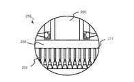 [0029]面板217は、上部が狭く、底部に向かって広がっている、ピラミッド形の、円錐形の、又は別の類似した構造のものでありうる。加えて、面板217は、図示しているように平坦であってもよく、プロセスガスを分散させるために使用される複数の貫通チャネルを含みうる。プラズマ生成ガス及び/又はプラズマ励起種は、RPS201の使用に応じて、第1プラズマ領域215内により均一に送られるよう、図2Bに示している面板217の複数の孔を通過しうる。 [0029]