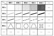 具体的には、属性aは、色であり、互いに異なる色を種類(1)から(5)として含む。「色が異なる」とは、対比される2つの色において色相、彩度、明度のうちの1つまたは複数が互いに異なることをいう。図4では、図示の便宜上、色である属性aの種類(1)から(5)を互いに濃淡の異なるグレースケールで示す。属性bは、太さであり、互いに異なる太さを種類(1)から(5)として含む。図4に示す属性bの例では、種類(1)から(5)の順に太さが太くなる。属性cは、線種であり、互いに異なる線種を種類(1)から(5)として含む。図4に示す属性cの例では、種類(1)は実線であり、種類(2)は点線であり、種類(3)は鎖線であり、種類(4)は一点鎖線であり、種類(5)は二点鎖線である。属性dは、図形であり、互いに異なる図形を種類(1)から(5)として含む。図4に示す属性dの例では、種類(1)は三角形であり、種類(2)は四角形であり、種類(3)は円形であり、種類(4)は台形であり、種類(5)は斜め十字形である。 Specifically, the attribute a is a color and includes mutually different colors as types (1) to (5). “Different colors” means that one or more of hue, saturation, and lightness of two contrasting colors are different from each other. In FIG. 4, for convenience of illustration, types (1) to (5) of the attribute a, which is a color, are shown in gray scales having different shades. The attribute b is thickness, and includes mutually different thicknesses as types (1) to (5). In the example of the attribute b shown in FIG. 4, the thickness increases in the order of types (1) to (5). The attribute c is a line type, and includes different line types as types (1) to (5). In the example of the attribute c shown in FIG. 4, the type (1) is a solid line, the type (2) is a dotted line, the type (3) is a chain line, the type (4) is a one-dot chain line, and the type (5 ) Is a chain double-dashed line. The attribute d is a figure, and includes figures different from each other as types (1) to (5). In the example of the attribute d shown in FIG. 4, the type (1) is a triangle, the type (2) is a quadrangle, the type (3) is a circle, the type (4) is a trapezoid, and the type (5). Is a diagonal cross.