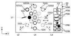 図10では、複数のサンプル画像GS2に沿う直線L2がX方向およびY方向に対して傾斜する。また、図10に例示される複数のサンプル画像GS3は、X方向およびY方向に対して直線L2とは反対側に傾斜する直線L3上に並んで配置される。ここで、直線L3は、直線L1およびL2の交点で交差する。このため、第1画像群GSG1、第2画像群GSG2および第3画像群GSG3は、互いに領域Rにて部分的に重なる。 In FIG. 10, the straight line L2 along the plurality of sample images GS2 is inclined with respect to the X direction and the Y direction. In addition, the plurality of sample images GS3 illustrated in FIG. 10 are arranged side by side on a straight line L3 inclined to the opposite side of the straight line L2 with respect to the X direction and the Y direction. Here, the straight line L3 intersects at the intersection of the straight lines L1 and L2. Therefore, the first image group GSG1, the second image group GSG2, and the third image group GSG3 partially overlap each other in the region R.