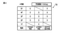ここで、例えば3階から5階へ向かう利用者の行先呼びが登録された場合に、A号機が3階と4階から出発する時点で、利用者の荷重(例えば65kg)を予約テーブルTBの該当する値に加算した結果が予め設定された予約閾値(例えば650kg)を超えないか否かをチェックする。予約閾値を超える階が1か所でもある場合は、A号機が混雑すると予測されるため、利用者の行先呼びをA号機に割り当てられないと判断する。図3の例では、予約閾値を超えていないので、利用者の行先呼びをA号機に割り当てることは可能であると判断する。なお、A号機に着目して説明したが、他の号機についても同様である。 Here, for example, when the destination call of the user heading from the 3rd floor to the 5th floor is registered, the load of the user (for example, 65 kg) is stored in the reservation table TB when the machine A departs from the 3rd floor and the 4th floor. It is checked whether or not the result of addition to the corresponding value exceeds a preset reservation threshold value (for example, 650 kg). If there is even one floor that exceeds the reservation threshold, it is predicted that the number A machine will be congested, so it is determined that the destination call of the user cannot be assigned to the number A machine. In the example of FIG. 3, since the reservation threshold is not exceeded, it is determined that the destination call of the user can be assigned to the car A. It should be noted that although the description has been made focusing on the No. A machine, the same applies to the other No. machines.