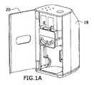 図1Aでは、本発明の機器対象物の前部ドア(20)だけが開いた位置にある完全なシステム、および基礎容器および添加物容器を交換することができる、ユーザが機器と対話するための前部領域を認めることができる。 In FIG. 1A, the complete system in which only the front door (20) of the device object of the invention is in the open position, and the base and additive containers can be replaced for the user to interact with the device. The front area can be recognized.