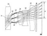 第5レンズは、コマ収差、非点収差、歪曲収差を良好に補正する。また、光軸近傍で物体側に凹面を向けることにより、非点収差、歪曲収差のより良好な補正が可能になる。 The fifth lens satisfactorily corrects coma, astigmatism, and distortion. Further, by directing the concave surface toward the object near the optical axis, better correction of astigmatism and distortion becomes possible.