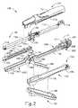 したがって、望ましいことに、1つのアクチュエータが他方のアクチュエータと比較してリニアステープラの反対の面からアクセス可能である一対のアクチュエータを有する発射アセンブリを設けることができる。加えて、上の説明に従って、例示的な使用中、把持されたアクチュエータが作動ビームを駆動する間に、把持されていないアクチュエータが近位位置に留まるようにすることが望ましい場合がある。あるいは、1つのアクチュエータが各々の側面からアクセス可能であり、両方のアクチュエータが作動ビームに連結される、一対のアクチュエータを有する発射アセンブリを設けることが望ましい場合がある。しかし、上記の例とは異なり、把持されていないアクチュエータが、作動ビームに向かって側方内側に延在して、例示的な使用中に第1及び第2の部分(102、104)の把持を妨げないように、非突出の外形を設けることが更に望ましい場合がある。 Therefore, it is desirable to provide a launch assembly with a pair of actuators in which one actuator is accessible from the opposite side of the linear stapler as compared to the other actuator. In addition, as described above, it may be desirable to ensure that the non-grasped actuator stays in the proximal position while the gripped actuator drives the working beam during exemplary use. Alternatively, it may be desirable to provide a launch assembly with a pair of actuators, one actuator accessible from each side and both actuators connected to the working beam. However, unlike the above example, the non-grasped actuator extends laterally inward towards the working beam to grip the first and second parts (102, 104) during exemplary use. It may be more desirable to provide a non-protruding outer shape so as not to interfere with the above.