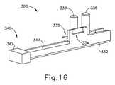 図15〜図16は、作動ビーム(330)の例示的な近位端を示す。作動ビーム(330)は、第1の部分(350)のチャネル(358)内に摺動可能に収容される。作動ビーム(330)及びステープルスレッドアセンブリ(342)は、それぞれ、上述した作動ビーム(202)及びステープルスレッドアセンブリ(160)と実質的に同様であり得、違いは以下で詳述されることを理解されたい。したがって、作動ビーム(330)は、上述の作動ビーム(202)の遠位端(201)と実質的に同様である遠位端(340)に向かって第1の部分(250)のチャネル(358)を通って遠位に延在するビーム部分(344)を含む。したがって、作動ビーム(330)の遠位端(340)は、ステープルスレッドアセンブリ(342)と選択的に連結するように構成されてもよい。あるいは、作動ビーム(330)の遠位端は、ステープルアセンブリ(342)を含み得る。いくつかの図では、明確にするために、ビーム部分(344)及びステープルスレッドアセンブリ(342)は省略されていることを理解されたい。 15-16 show exemplary proximal ends of the working beam (330). The working beam (330) is slidably housed in the channel (358) of the first portion (350). It is understood that the working beam (330) and staple thread assembly (342) can be substantially similar to the working beam (202) and staple thread assembly (160) described above, respectively, and the differences are detailed below. I want to be. Thus, the working beam (330) is directed towards the distal end (340), which is substantially similar to the distal end (201) of the working beam (202) described above, in the channel (358) of the first portion (250). ) Includes a beam portion (344) extending distally through. Therefore, the distal end (340) of the working beam (330) may be configured to selectively connect with the staple thread assembly (342). Alternatively, the distal end of the working beam (330) may include a staple assembly (342). It should be understood that in some figures, the beam portion (344) and the staple thread assembly (342) are omitted for clarity.
