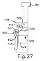 具体的には、各レバー(510、520)は、カムスロット(512、516)を画定し、ピン(508、509)をそれぞれ収容する。カムスロット(512、516)は、それぞれのレバーが側方に延在する位置に枢動されると、ピン(508、509)と接触するように構成される。例えば、図26Aは、近位の発射前の位置にある第1のレバー(510)及び第2のレバー(514)の両者を示す。図26Bに示すように、操作者は、発射アセンブリ(500)を作動させるために第2のレバー(514)を作動させる準備において、第2のレバー(514)を側方に延在する位置に枢動させることができる。第2のレバー(514)が側方に延在する位置へと枢動すると、カムスロット(516)はピン(509)と接触し、それによってピン(509)を近位本体(503)から側方に離れるように押す。結果として、摺動連結アーム(506)は、近位本体(503)の横方向チャネル(505)内で摺動し、それによってピン(508)を近位本体(503)に向かって摺動させる。これにより、ピン(508)は、発射中にレバー(510)を近位本体(503)に向かって非突出の外形に回転させるために、カムスロット(512)と接触する。したがって、使用者が、上記の説明に従って第2のレバー(514)を作動させて発射アセンブリ(500)を作動させると、第1のレバー(510)は器具(400)の把持を妨げない場合がある。 Specifically, each lever (510, 520) defines a cam slot (512, 516) and houses a pin (508, 509), respectively. The cam slots (512, 516) are configured to come into contact with the pins (508, 509) when each lever is pivoted to a laterally extending position. For example, FIG. 26A shows both the first lever (510) and the second lever (514) in the proximal pre-launch position. As shown in FIG. 26B, the operator is in a position where the second lever (514) extends laterally in preparation for activating the second lever (514) to activate the launch assembly (500). Can be pivoted. When the second lever (514) is pivoted to a laterally extending position, the cam slot (516) contacts the pin (509), thereby displacing the pin (509) from the proximal body (503). Push away from it. As a result, the sliding coupling arm (506) slides within the lateral channel (505) of the proximal body (503), thereby sliding the pin (508) towards the proximal body (503). .. This causes the pin (508) to contact the cam slot (512) during firing to rotate the lever (510) towards the proximal body (503) in a non-protruding outer shape. Therefore, when the user activates the second lever (514) to activate the launch assembly (500) according to the above description, the first lever (510) may not interfere with the gripping of the instrument (400). is there.