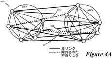 図示したように、パス識別レイヤは、最初に(505において)ルーティンググラフを測定グラフと同一であるように定義する(すなわち、管理転送ノードの同一ペア間に同一のリンクを有するようにする)。510において、プロセスは、測定グラフ300から不良リンクを除去する。不良リンクの例としては、過剰なメッセージ損失や信頼性の低いリンク(たとえば、過去15分間にメッセージ損失が2%を超えたリンクや、過去2分間にメッセージ損失が10%を超えたリンク)がある。図4Aは、測定グラフ300内のリンク302、304および306が、ルーティンググラフ400内で除外されることを示す。この図は、これらのリンクを破線で表すことによって、これらのリンクを除外する方法を示している。 As illustrated, the path identification layer first defines (at 505) the routing graph to be identical to the measurement graph (ie, to have the same link between the same pair of managed transfer nodes). At 510, the process removes the bad link from the