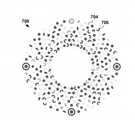 図4は、形状506a、506bの視覚パターン504を備える符号化500の1つの例示的実施形態を示す。形状506a、506bは、値(たとえば、グレースケール実施形態では白から黒の範囲、および、随意に、白、ライトブルー、ダークブルーなど、1つまたは複数の所定の値にビニングされている範囲)、配向(たとえば、形状506aなど、正の半径方向、または形状506bなど、負の半径方向)、および/またはロケーション(たとえば、符号化500の象限(quadrants)に基づく)に基づいて、情報を符号化し得る。図5の別の例示的実施形態は、異なるサイズ、値、および位置の複数の形状606の視覚パターン604を備えた例示的な符号化600を示す。図6で実証されるように、例示的な符号化700は、その各々が値、位置、配向、およびサイズに関連付けられ得る、複数の形状706を含む視覚パターン704を備え得るため、視覚パターンは、いずれかの単一形状の変形形態に限定されない。別の例示的な符号化は、同心リングの形に構成された連続形状を有する視覚パターンを採用し得る。形状、値、位置、配向、およびサイズが符号化データに対応し得るように、位置のグループも一定のデータクラスに対応し得る。たとえば、符号化の1つまたは複数のリングは、特定のクラスのデータ(たとえば、識別番号)を符号化するために割り当てられてよく、リングの中の各弧セグメントの長さおよび/または値は、その値を示し得る。 FIG. 4 shows one exemplary embodiment of the