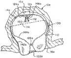 図1A及び図1Cに例示されているとおり、第2の埋め込み形状にある管状編組110は、所定の形状に比べて、半径方向に圧縮され得、所定の形状の中間セグメント144は、折り重ねられることができ、その結果、管状編組110の高さは、所定の形状に比べて、第2の埋め込み形状に圧縮される。代替的に、第2の埋め込み形状は、動脈瘤の高さよりも著しく小さい直径を有する動脈瘤に、第2の埋め込み形状で埋め込まれると、所定の形状に比べて、半径方向に圧縮され得、第2の埋め込み形状にある編組の高さは、所定の形状にある編組の高さよりも高くあることができる。 As illustrated in FIGS. 1A and 1C, the