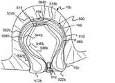 2つの層510、560は、共に押し込んで、より強力な単層編組のように機能する可能性があり、これは、いくつかの用途では、角度のある動脈瘤におけるインプラントの展開を容易にすることができる。動脈瘤内に展開されると、2つの層のそれぞれの外側セグメントは、動脈瘤壁に対して外向きに拡張して、動脈瘤壁に対して編組を安定化させる。単一の編組層を有するインプラントを2つ又は3つ以上の編組層を有するインプラントと比較して、2つのインプラントは、同様のサイズ及び形状の所定の形状を有し、単一の編組層は、動脈瘤の頸部の近くでの反転を容易にするために、カテーテルの遠位端部の再位置決めを必要とし得、一方、2つ又は3つ以上の編組層を有するインプラントは、カテーテルの遠位端部の再位置決めを必要とせずに、挟持端部の遠位移動によって動脈瘤頸部の近くで反転させ得る。追加のワイヤ数はまた、動脈瘤ドームにおける適合性及び支持を増加させることができる。 The two
