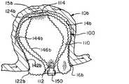 図1Cに例示されているとおり、編組110は、第2の埋め込み形状にあるとき、動脈瘤壁14bに接触する外側層142b、動脈瘤頸部16bに位置決めされている近位反転部122b、外側層142b内に延在し、外側層142bを押し込む中間層144b、編組110の開放端部114の近傍に位置決めされた遠位反転部124b、及び中間層144b内に延在しており中間層144bを押し込む内側層146bを有することができる。第2の埋め込み形状では、編組110の脱着機構部150及び挟持端部112は、近位反転部122bの近傍の動脈瘤頸部16bに位置決めされ得る。 As illustrated in FIG. 1C, the