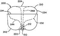 図7Aに例示されている編組210の所定の形状と図1Aに例示されている編組110の所定の形状とを比較すると、外側セグメント142、242及び中間セグメント144、244は、それぞれ、互いに類似しており、図7Aに例示されている編組210の内側セグメント248は、図1Aに例示されている編組110の内側セグメント146よりも長い。図7A中の編組210の挟持端部212は、図1Aに例示されている内側セグメント146の近傍の反転部124の近傍よりもむしろ、外側セグメント242に隣接する反転部222の近傍に位置決めされる。図7Aに例示されている細長い内側セグメント248は、図7Bに例示されているとおりに埋め込まれた場合、インプラント200が圧縮に耐性を示す一助となるように位置決めされ得る。 Comparing the predetermined shape of the