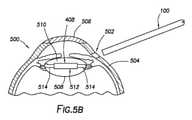 切開部502が作られた後、IOLインジェクタ装置100は、切開部502を通して眼500の内部510に挿入される。IOLインジェクタ装置100は、IOL408を眼500の水晶体嚢508に施すように作動される。施されると、IOL408は、初期の広がった状態に戻ることができ、IOL408は、図5Bに示されるように、眼500の水晶体嚢508内に収まる。水晶体嚢508は、IOL408の光学部品512が網膜(図示されない)に向けられた光を屈折させるように、眼500との相対関係で眼500内にIOL408を保持する。IOL408は、光学部品512から延び、水晶体嚢508と係合してそこにIOL408を固定する触覚部514を含む。IOL408を水晶体嚢508に施した後、IOLインジェクタ装置100は、切開部502を通して眼500から除去され、眼500は、時間とともに治癒することが可能になる。  After the