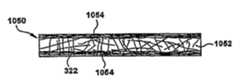 1つの例示的な一実施形態において、ウェブ370の6インチ×12インチの試料は複数層、例えば4つの折重ね(即ち、8層)を有し、0.875インチ厚と2.0インチ厚との間であり、0.15lbs/sqftと0.4lbs/sqftの間の重量毎平方フィートを有し、3lbfより大きい引張り強度を有し、40lbf/lbmより大きい、例えば約40乃至約130lbf/lbmの引張り強度対重量の比を有する。例示的な一実施形態において、ウェブは0.3lbs/sqftより大きい接着強度を有する。例示的な一実施形態において、この試料の接着強度は0.1lbs/sqftより大きい。